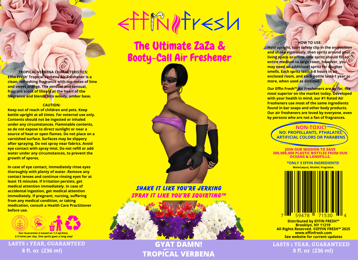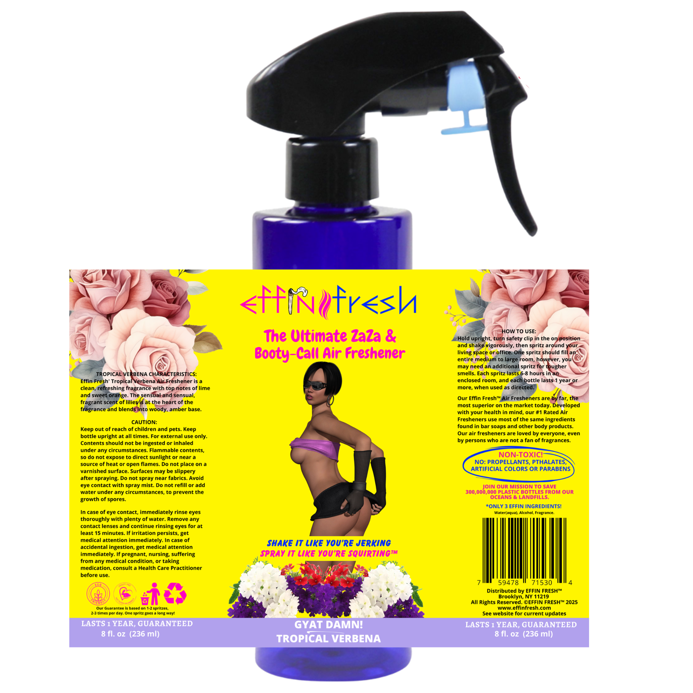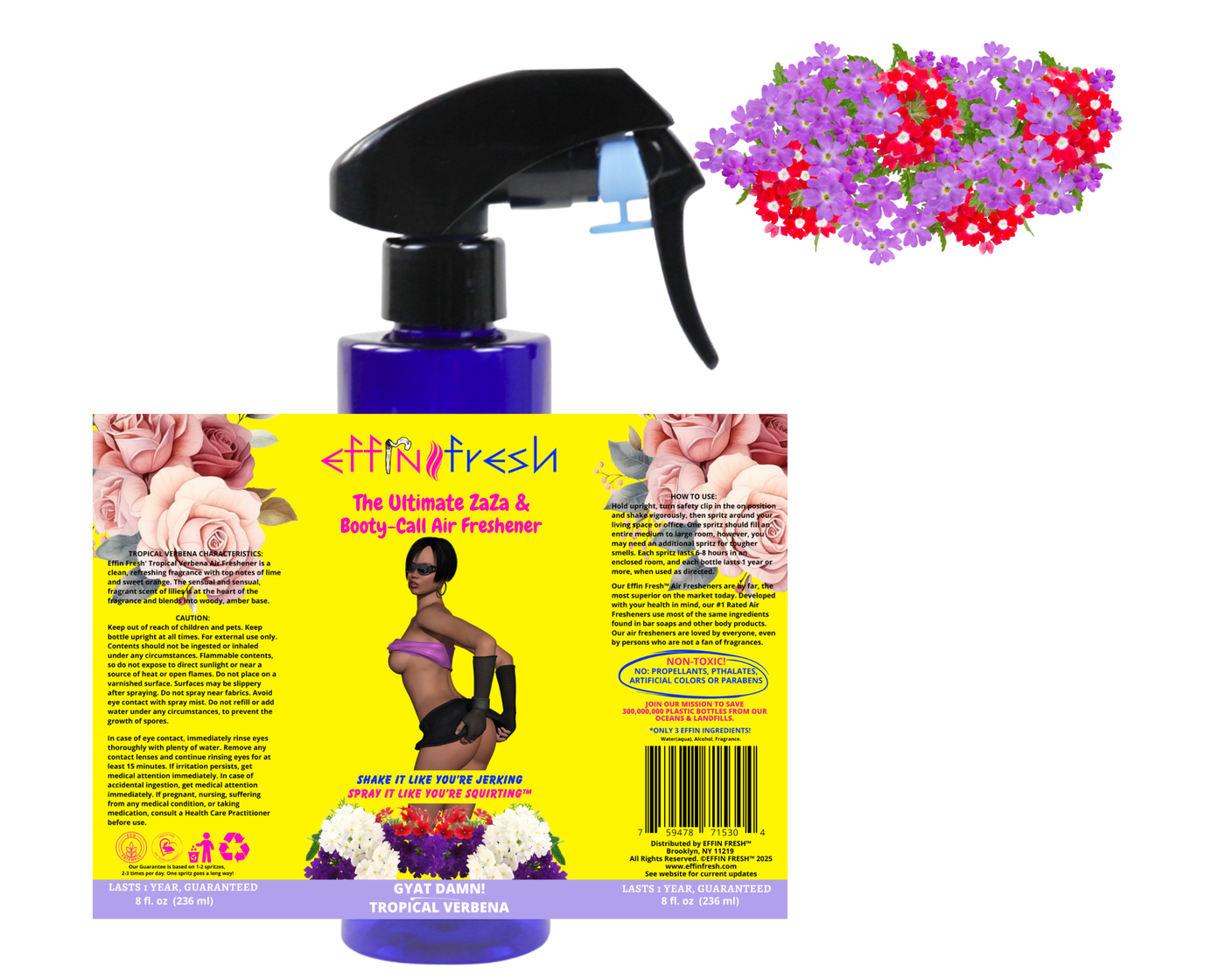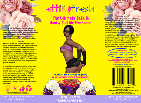 Effin Fresh' Tropical Verbena Air Freshener is a clean, refreshing fragrance with top notes of lime and sweet orange. The sensual and sensual, fragrant scent of lilies is at the heart of the fragrance and blends into woody, amber base.