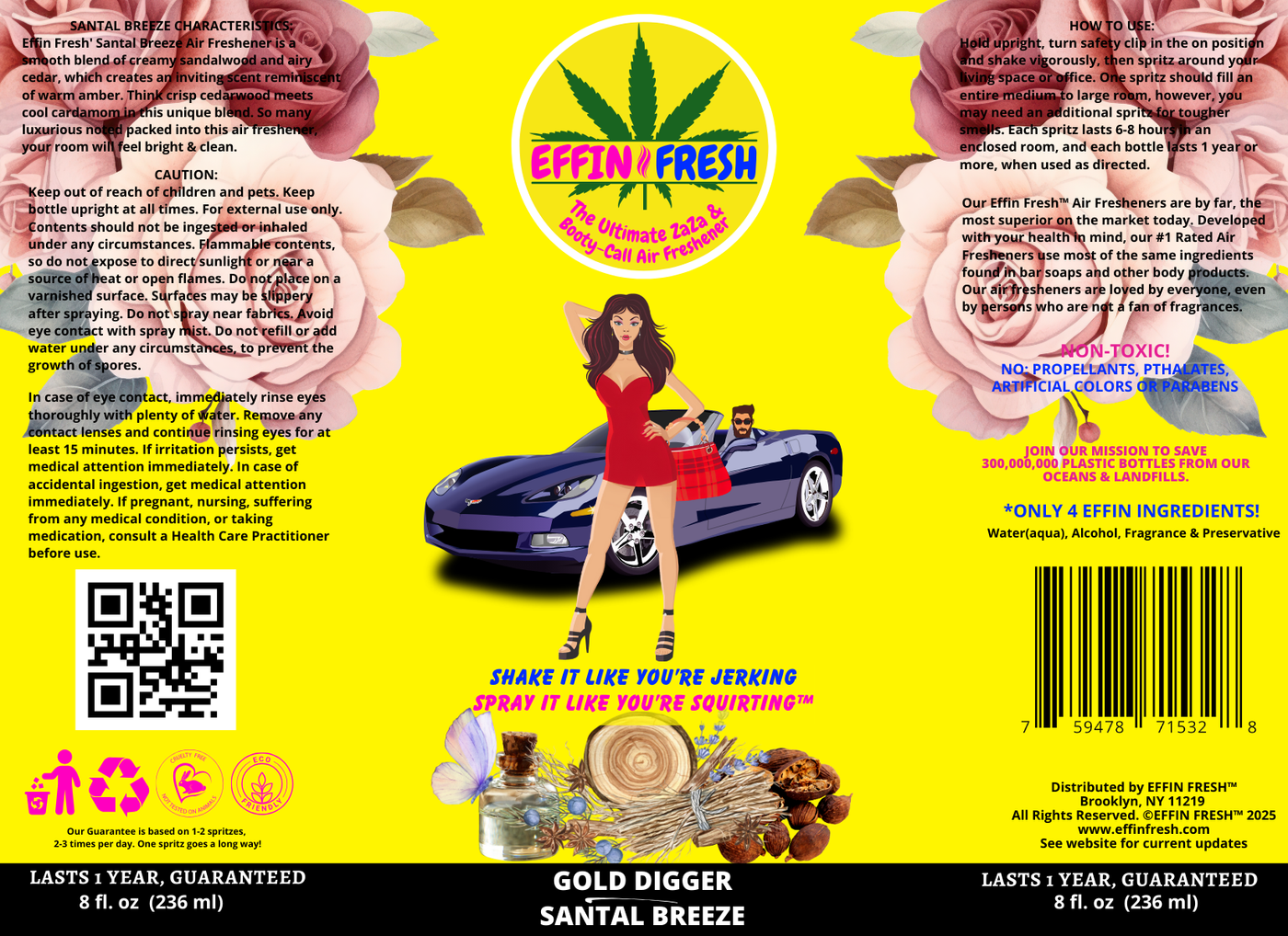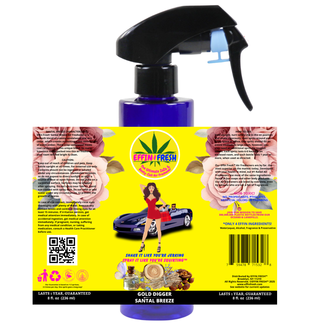 Effin Fresh' Santal Breeze Air Freshener is a smooth blend of creamy sandalwood and airy cedar, which creates an inviting scent reminiscent of warm amber. Think crisp cedarwood meets cool cardamom in this unique blend. So many luxurious noted packed into this air freshener, your room will feel bright & clean.