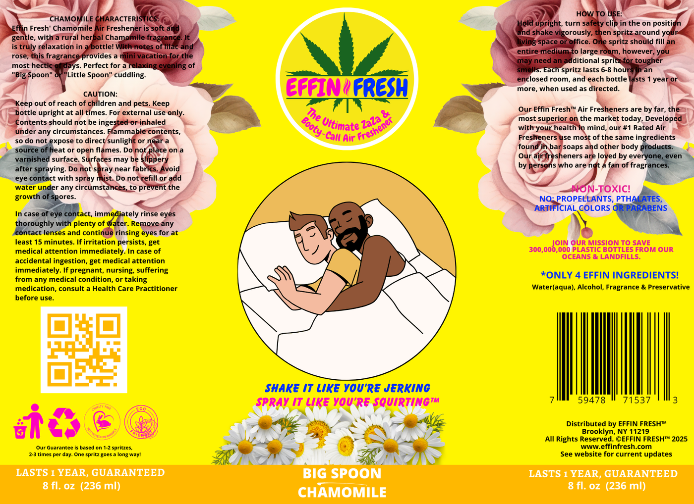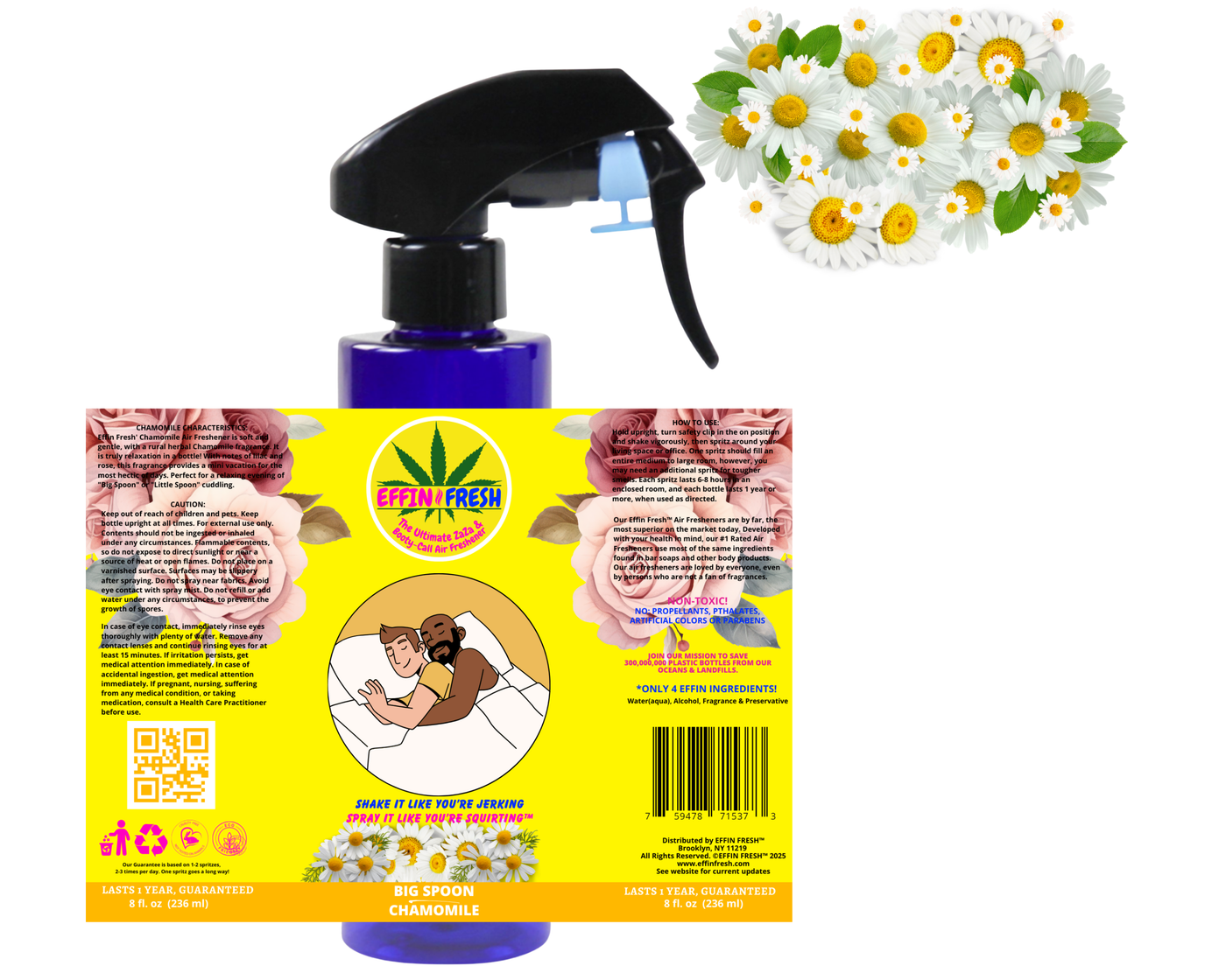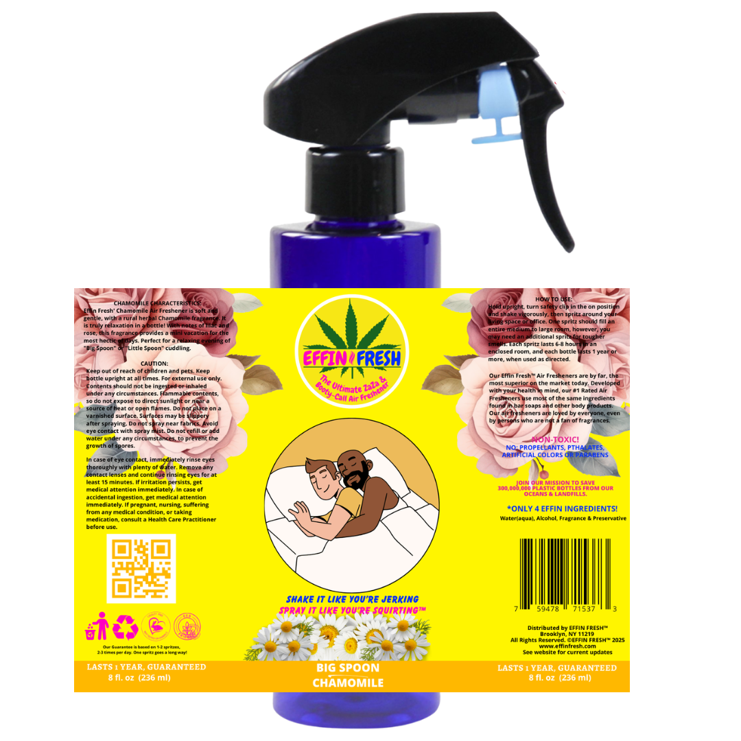 Effin Fresh' Chamomile Air Freshener is soft and gentle, with a rural herbal Chamomile fragrance. It is truly relaxation in a bottle! With notes of lilac and rose, this fragrance provides a mini vacation for the most hectic of days. Perfect for a relaxing evening of "Big Spoon" or "Little Spoon" cuddling.
