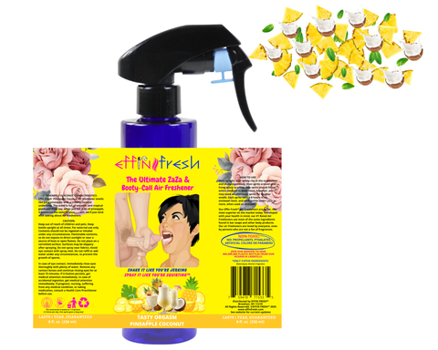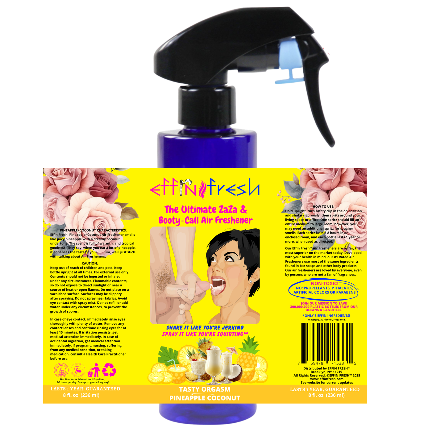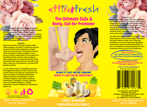 Effin Fresh' Pineapple~Coconut Air Freshener smells like juicy pineapple with a creamy coconut undertone. The scent is full of warmth, and tropical goodness! They say, when you eat a lot of pineapple, it enhances the taste of your........um, we'll just stick with talking about Air Fresheners.