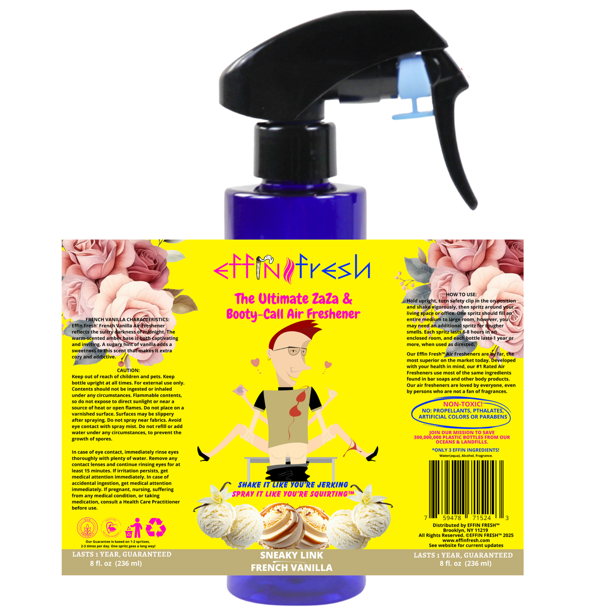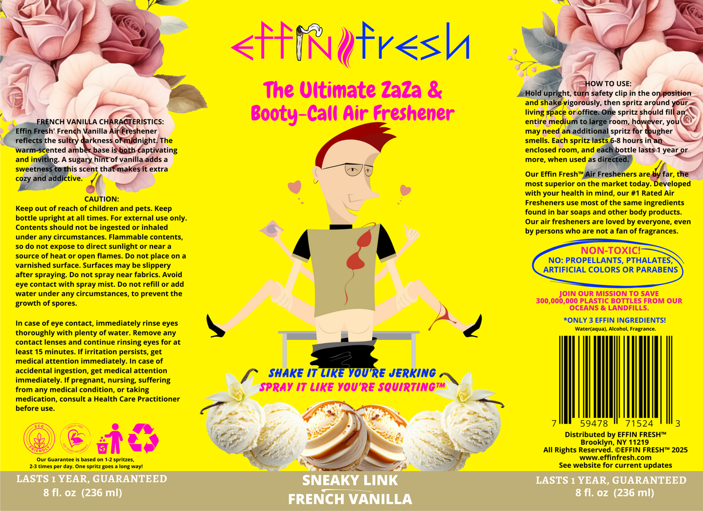 Effin Fresh' French Vanilla Air Freshener reflects the sultry darkness of midnight. The warm-scented amber base is both captivating and inviting. A sugary hint of vanilla adds a sweetness to this scent that makes it extra cozy and addictive.